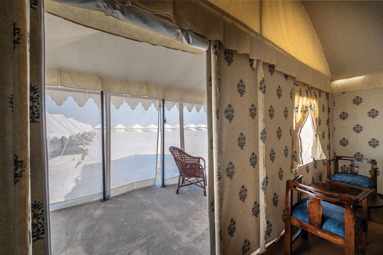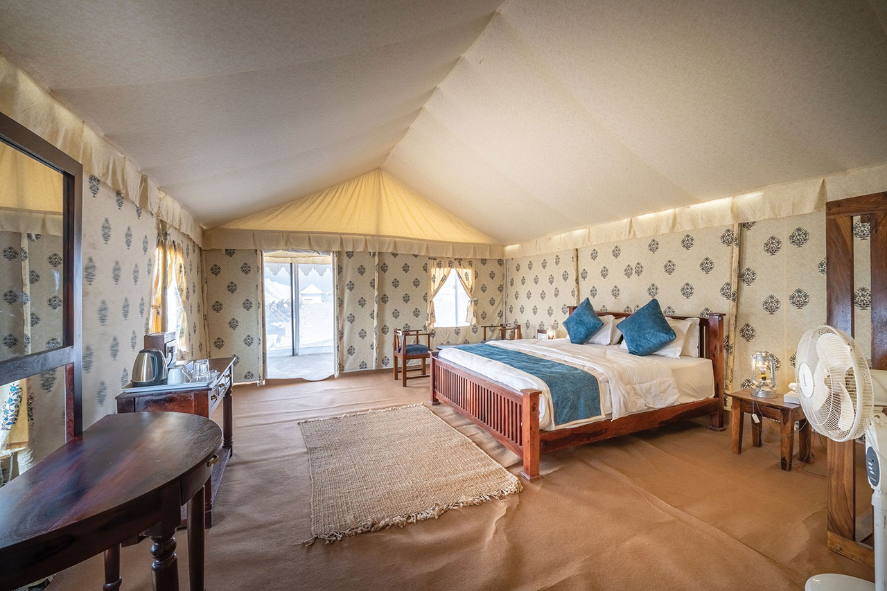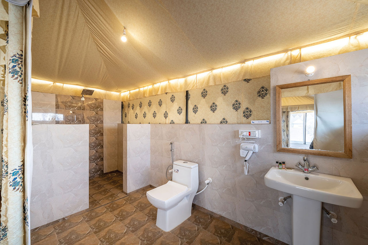 Prepare to be charmed by our luxurious and spacious Thar Semi-style tents that blend seamlessly with the picturesque desert landscape. Each tent is elegantly furnished with plush bedding and modern amenities, ensuring your utmost comfort during your stay. Wake up to breathtaking views of the sunrise over the dunes and fall asleep under the stars for an unparalleled desert dream.
